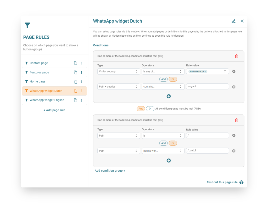 Page Rules in Buttonizer give you the ability to control where your buttons are displayed on your website. With Page Rules, you can set conditions that determine whether a button or group of buttons should be shown or hidden on certain pages: It’s like having a superpower to customize your buttons based on different scenarios!